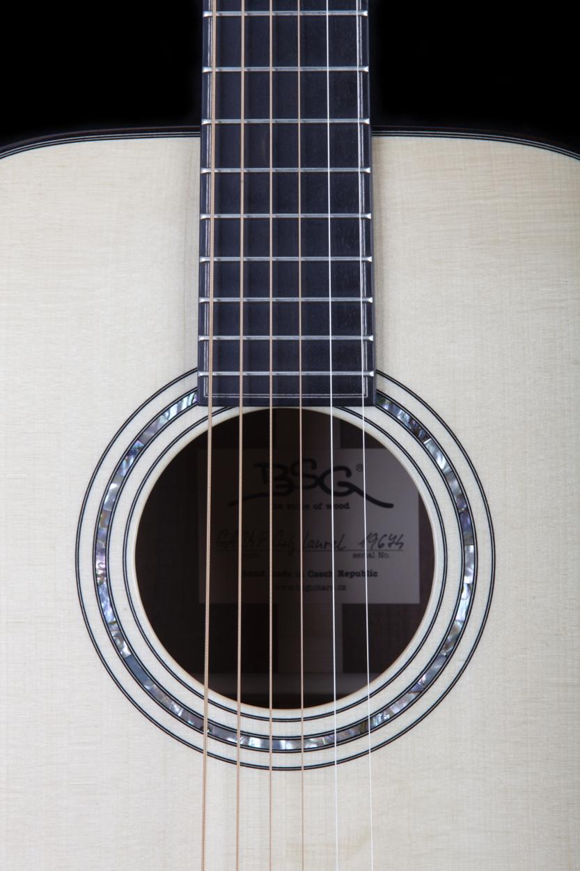Top: Spruce Back and sides: Curly Laurel Fingerboard, bridge and headplate: Ebony Neck: Mahogany Head style: M style Scale lenght: 650mm Body binding: Rosewood Neck binding: Ebony Rosette: Abalone Top purfling: 3 ply Fingerboard purfling: 3ply